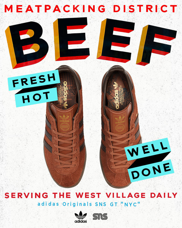 SNS and adidas Originals unite for a special SNS GT that pays homage to New York City and more specifically Meatpacking District. Located at the far west side of Manhattan and inside the many brown brick buildings, meat (packing) was at the essence of shops, warehouses, and markets. The historic neighborhood is the source of inspiration for the latest SNS GT, which comes dressed in brown premium suede with matching gum rubber midsole.