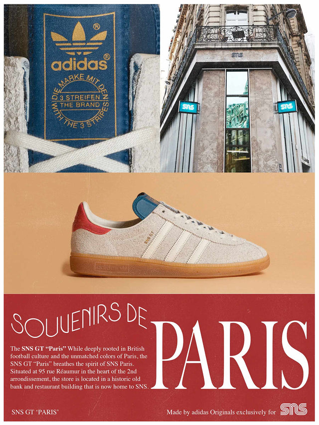 The SNS GT “Paris” takes its inspiration from British football fans following their team to the French capital. A souvenir from away games in the City of Light, with details that are one-of-a-kind and bring Parisian flair back home. The SNS GT “Paris” checks all the boxes as a cherished possession and memory to the atmosphere on game-day in Paris. Crafted with premium off-white hairy suede and featuring blue, Scarlet, and white leather overlays seen on the 3-Stripes, tongue, and heel tab, the insoles are printed with a map of Paris for the hometown feel. The GT version offers a Handball Spezial outsole fusing archival innovation with today’s streamlined look, creating an everyday pair of footwear, not just on game days.