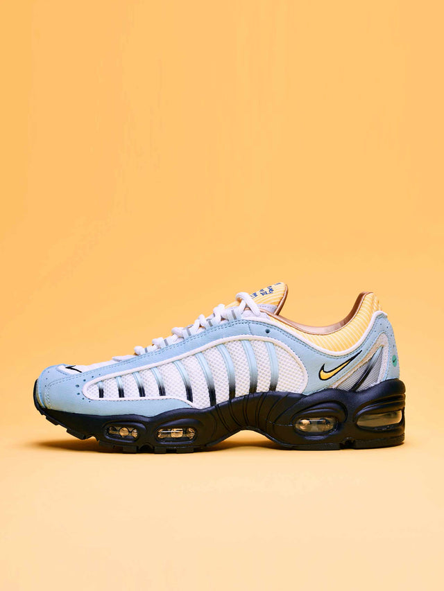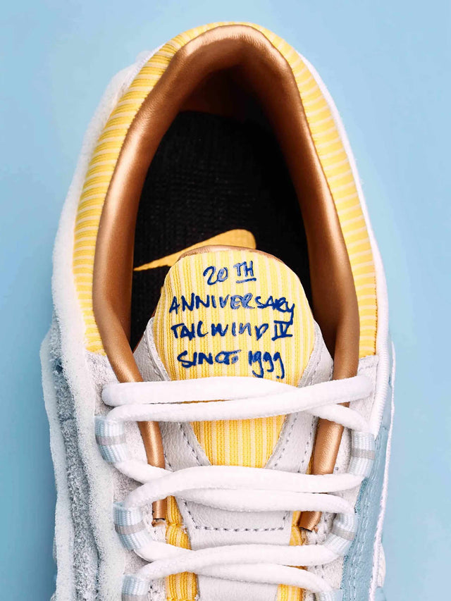 The bold new addition to the trailblazing series of Tailwind sneakers, which from the get-go featured groundbreaking technologies like the Air cushioning, fit right into the heart of a transitioning atmosphere. The design of the 20th Anniversary Nike Air Max Tailwind IV takes its inspiration from an unreleased prototype colorway of the '79 introduced Nike Air Tailwind, which in its own was a revolutionary silhouette, featuring a futuristic encapsulated Air-Sole technology for the first time in a Nike sneaker. The SNS exclusive Nike Air Max Tailwind IV samples color-bits from the original Tailwind, tying perfectly into the OG footsteps and also in the dotcom bubble utopianism, echoing the quest for a superhighway to a digital Avalon. Built with a promiscuous upper, full of polarity but coherence and balancing the unexpected, the individually numbered Nike Air Max Tailwind IV presented by SNS features a mélange of mesh, nubuck, and suede, sturdy textile, leather and protruded foam. Shiny yellow highlights are boasting distinctive lettering, captivating gold lining and a black midsole with visible Air bubble fuse heritage with the design hues from the turn of the century.