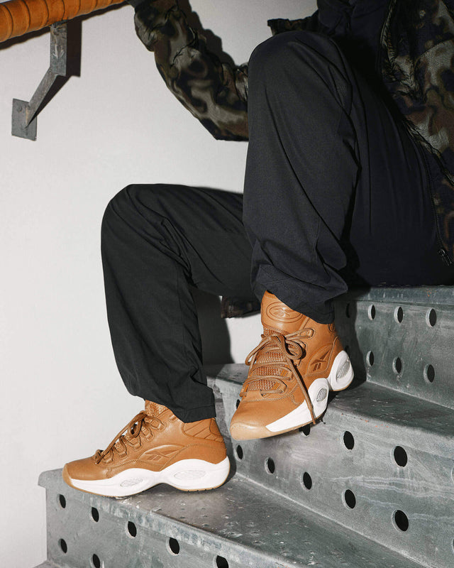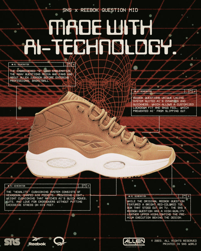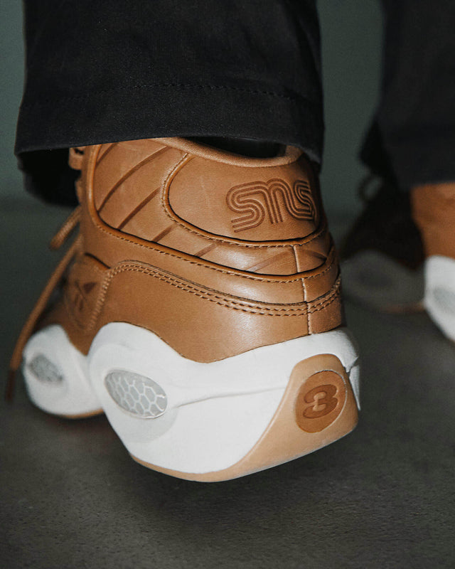 So, with the little help of AI and Reebok, we have reworked the iconic first signature shoe of Allen Iverson from 1996, the Question Mid, stripping it down to its essentials using nothing but the best materials. The SNS x Reebok Question Mid has a super-premium lux leather upper, something we have always wanted to do to showcase the versatility of the silhouette. Equipped with embroidered "Q" logo that emblematizes the many questions media and fans had about Allen Iverson before entering professional basketball, the shoe also features a unique lacing system that suits AI's dynamics and quickness. Finished off by signature "Hexalite" cushioning with hexagonal-shaped air pockets, the shoe provides lightweight cushioning that matches AI's quick moves, cuts, and love for cross-overs without putting excessive stress on his feet.
