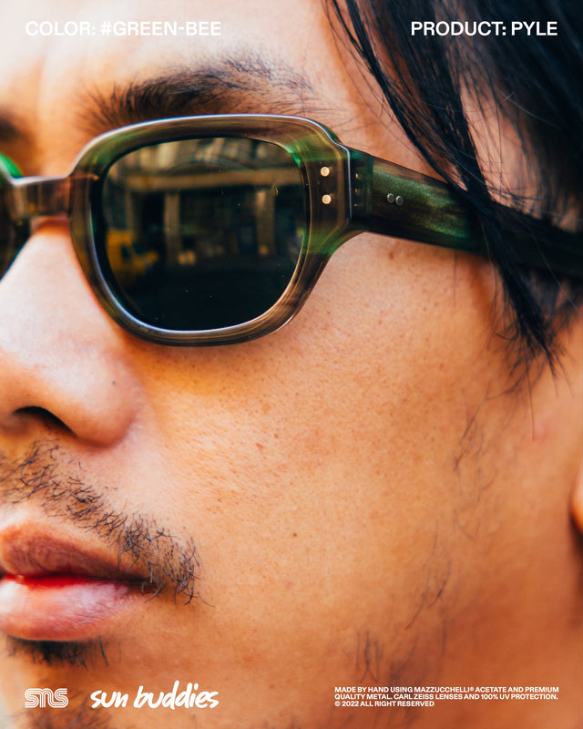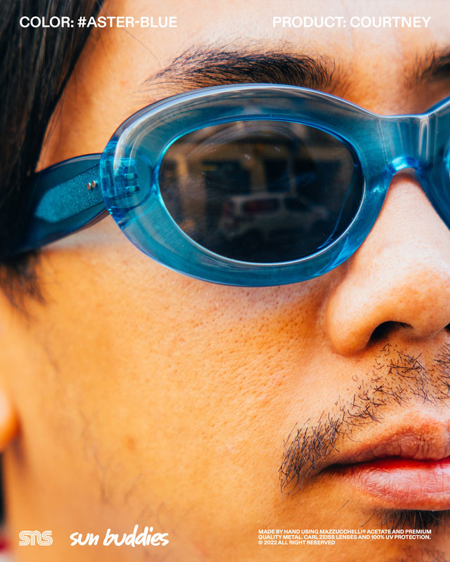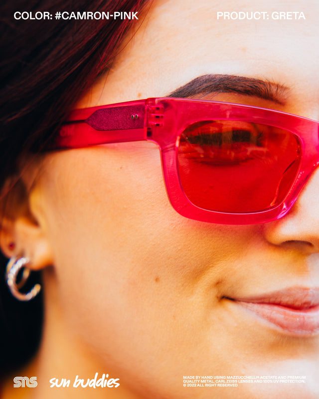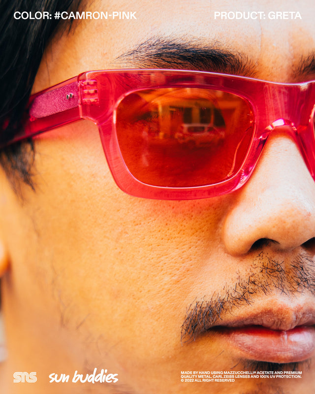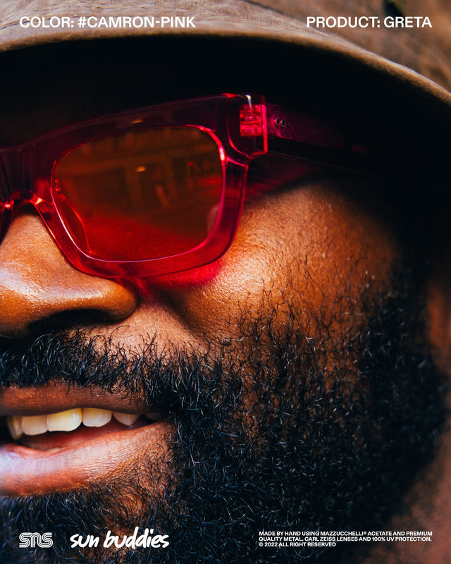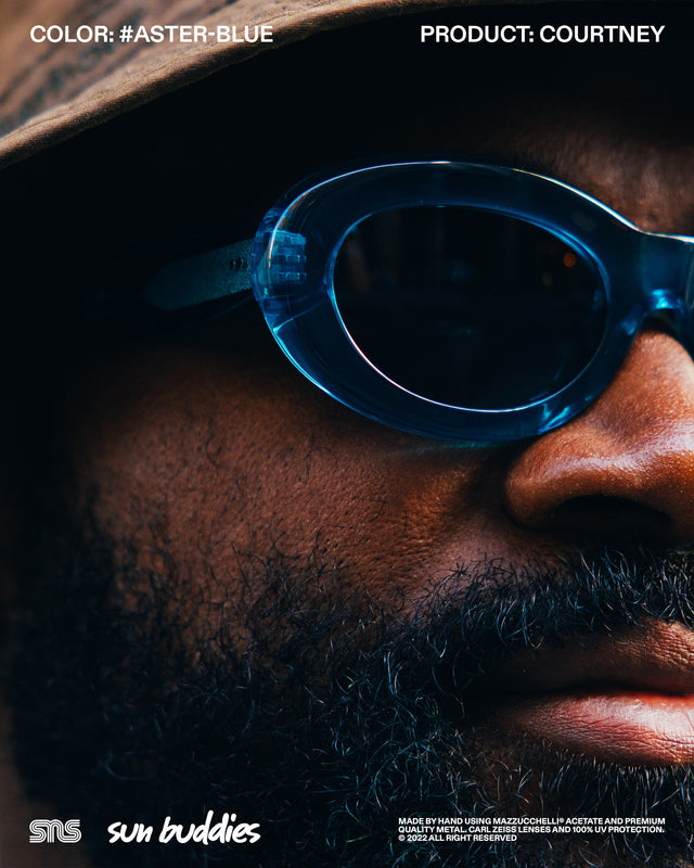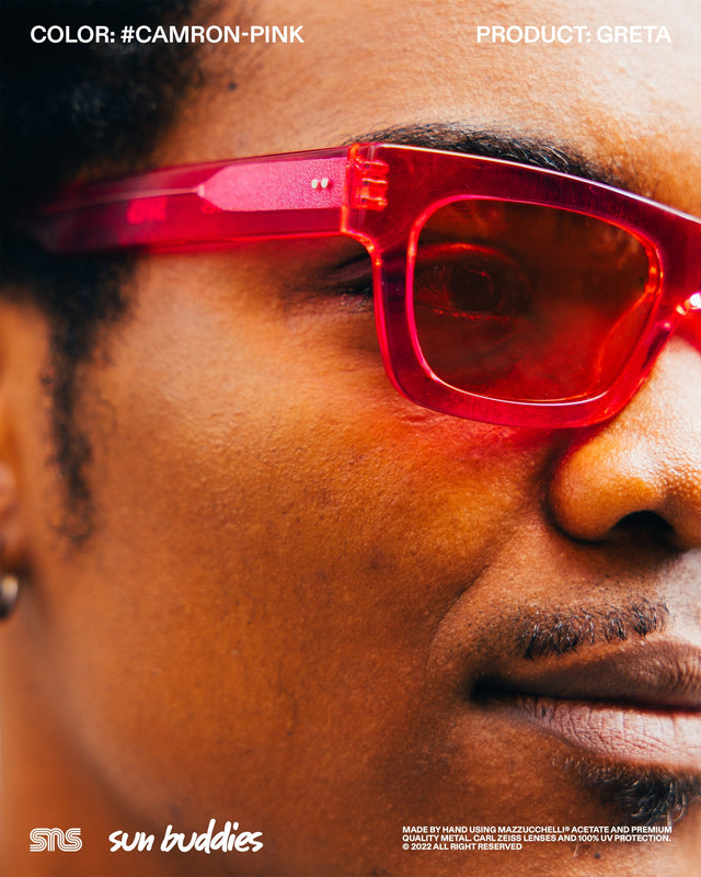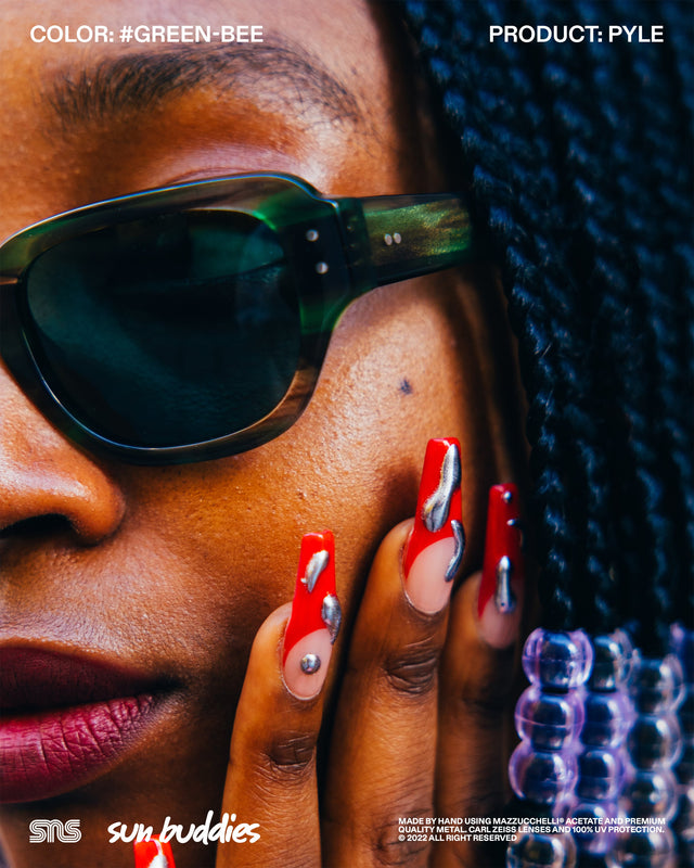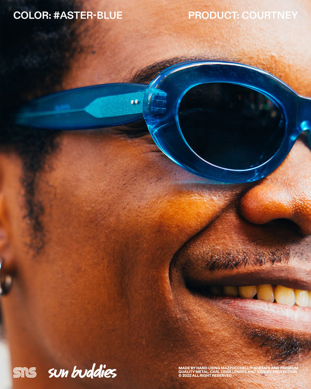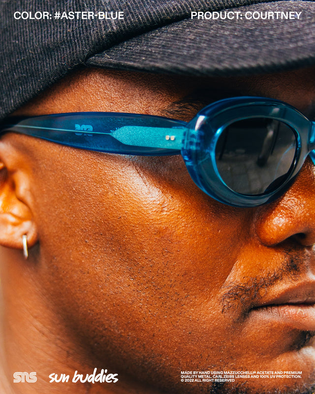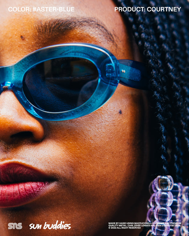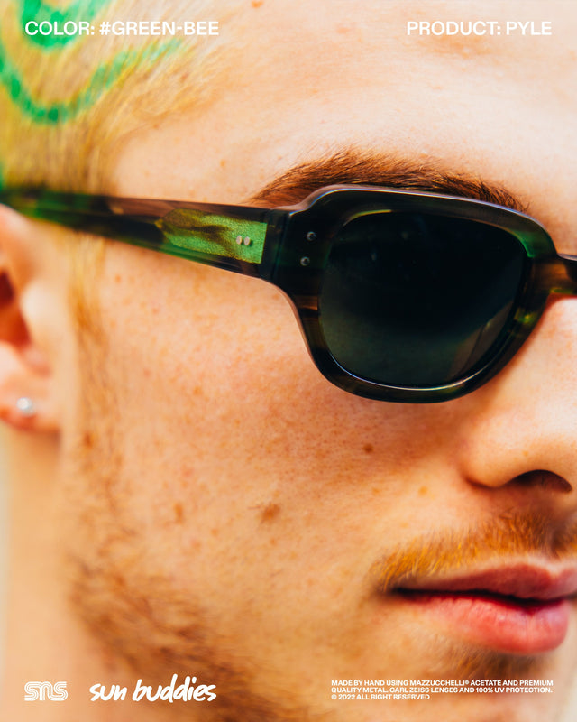 The Sun Buddies x SNS Courtney in speckled Aster Blue has a semi-transparent oval 90’s inspired frame with 100% UV blocking Carl Zeiss lenses. The Sun Buddies x SNS Greta in Cam’ron Pink has semi-transparent Carl Zeiss lenses with 100% UV protection. The Sun Buddies x SNS Pyle in a speckled Green Bee colorway is crafted with a transparent square frame that has rounded corners and Carl Zeiss Vision lenses with 100% UV protection. All three frames are co-branded and handmade of Italian acetate.