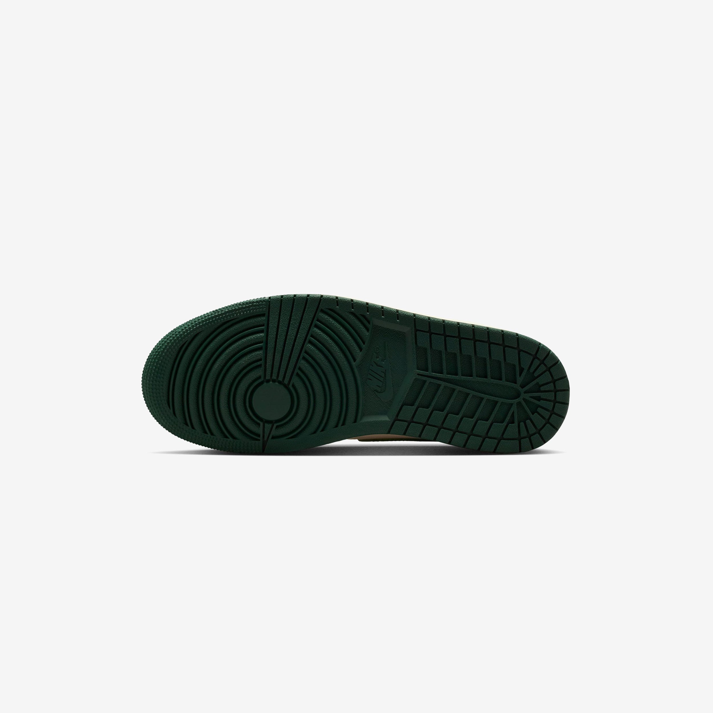 The Wmns Air Jordan 1 Retro High OG reimagines the iconic silhouette with a fresh, clean palette. Smooth white leather forms the base, while soft green overlays and subtle gold accents bring depth and character. A padded ankle collar and soft cushioning provide support, celebrating the design that started it all.