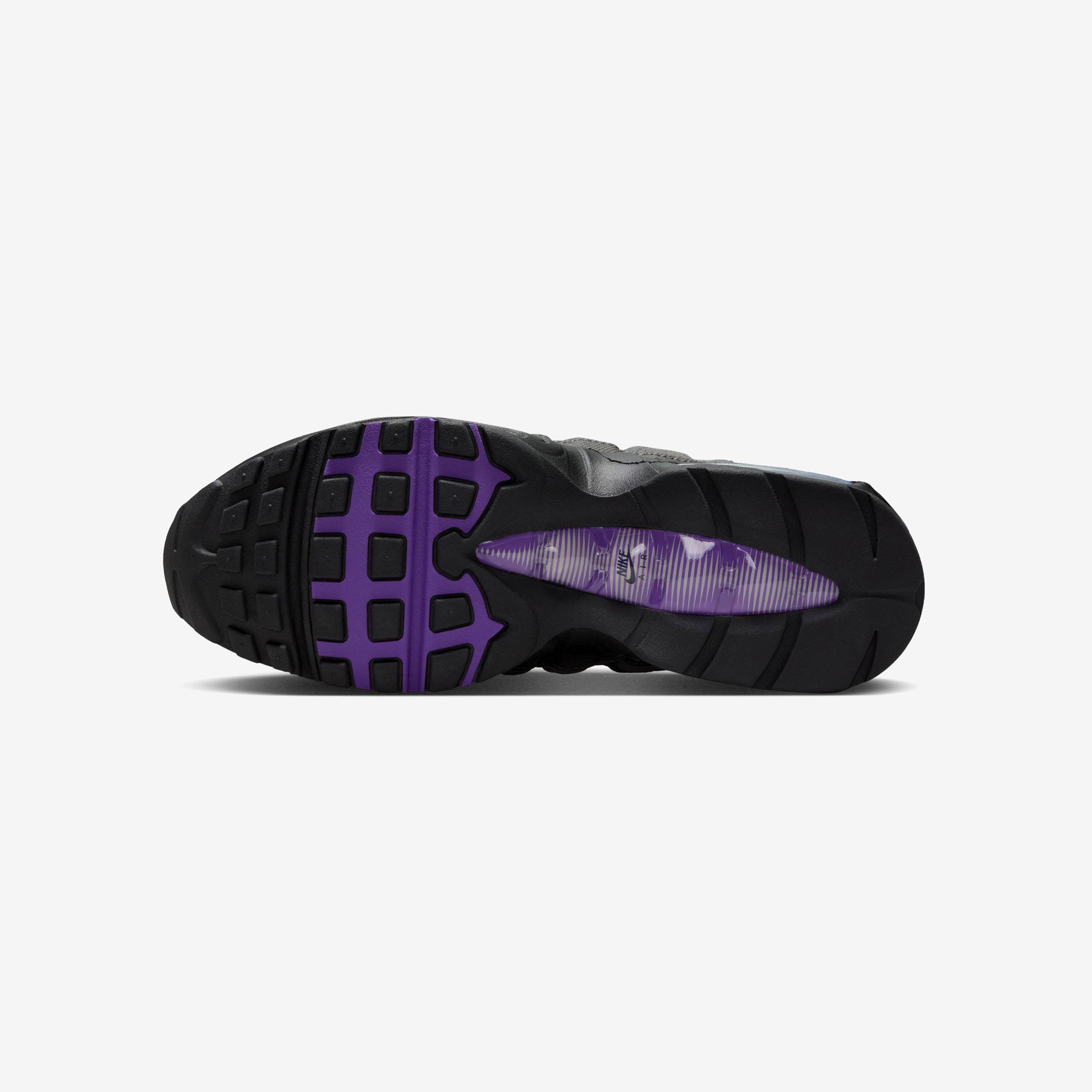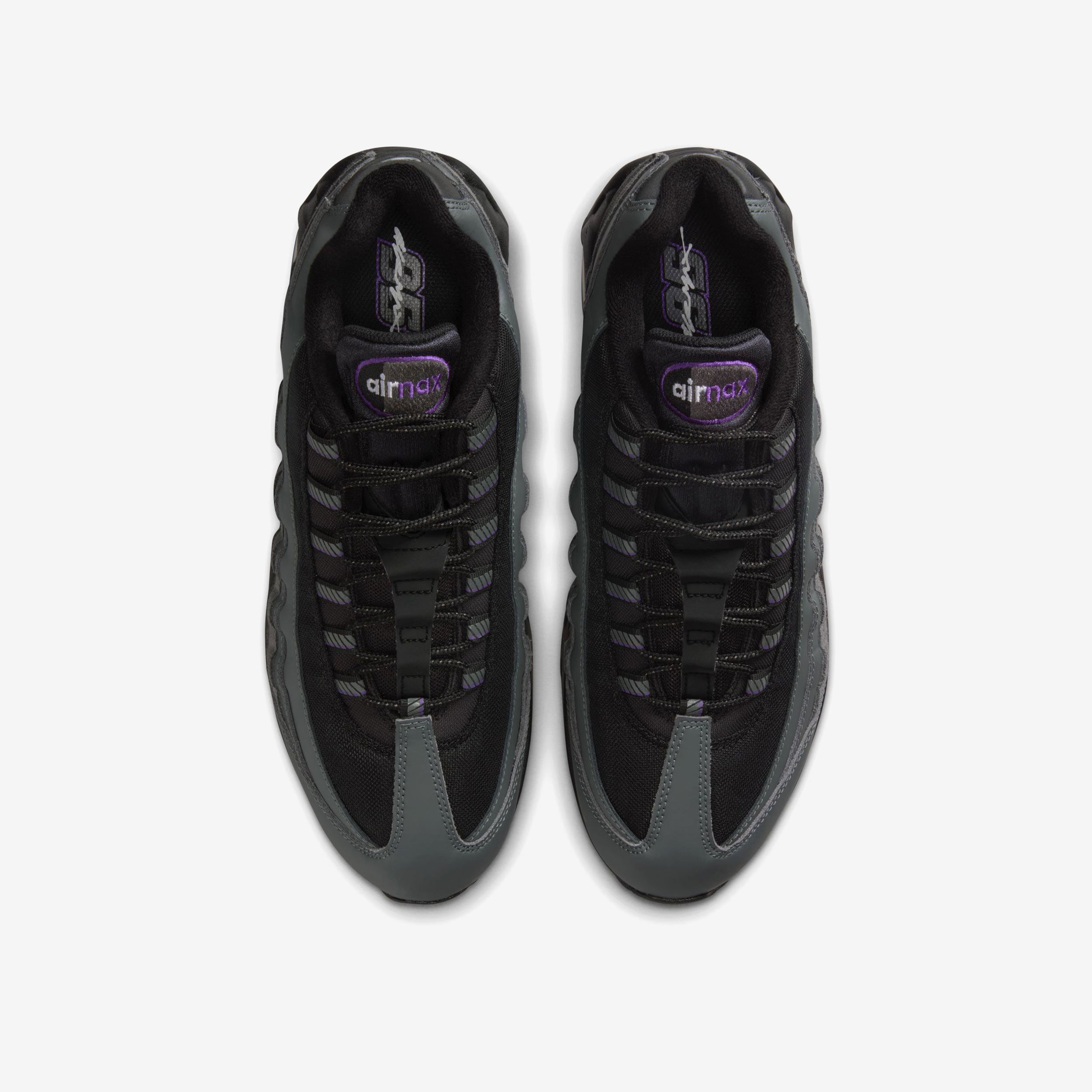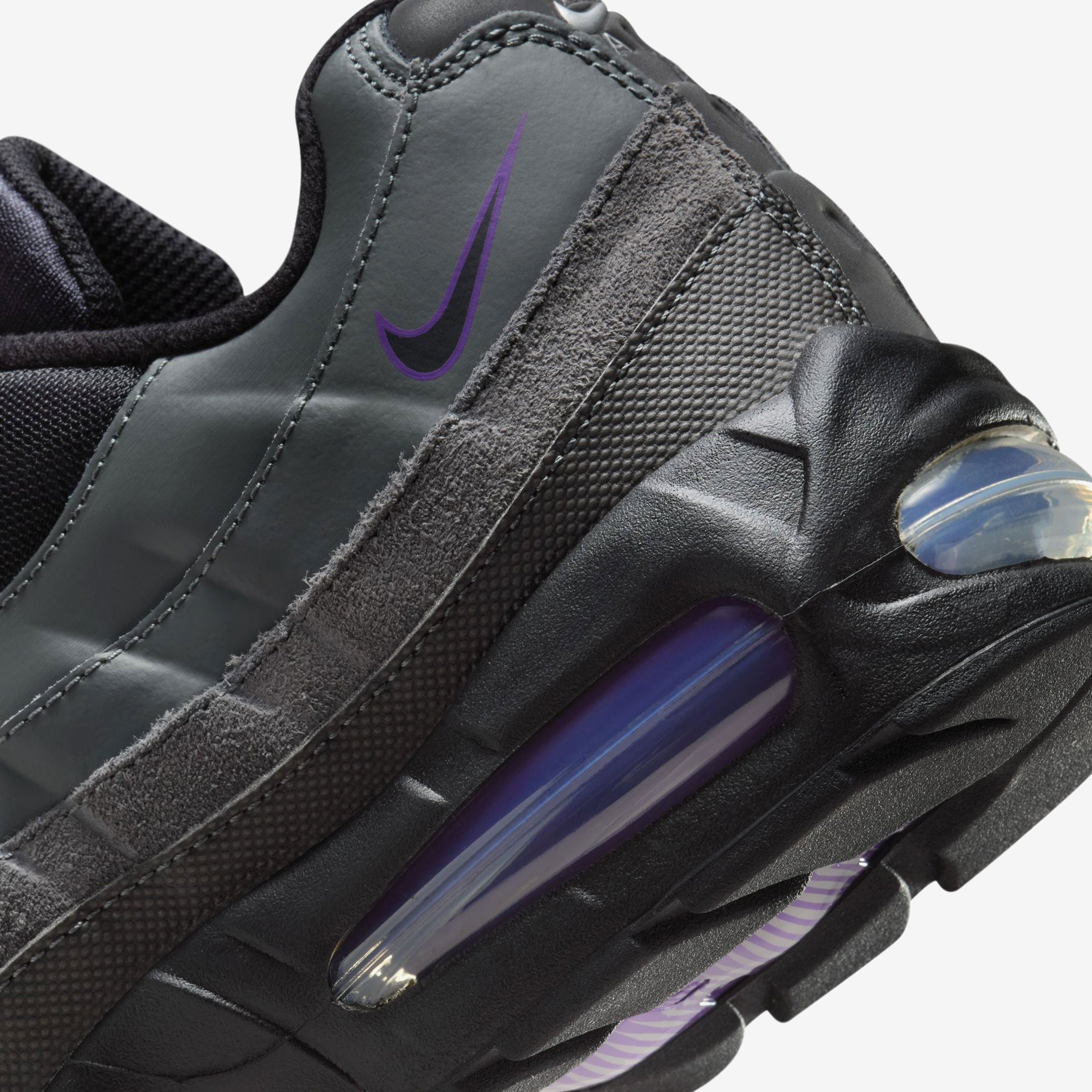 Layers of leather, mesh and suede form the upper in deep iron grey and black tones, accented by wild grape purple highlights for a bold yet structured silhouette. The visible Max Air units in the heel and forefoot deliver signature cushioning, while the padded collar and tongue ensure all‑day comfort for both performance and casual wear.